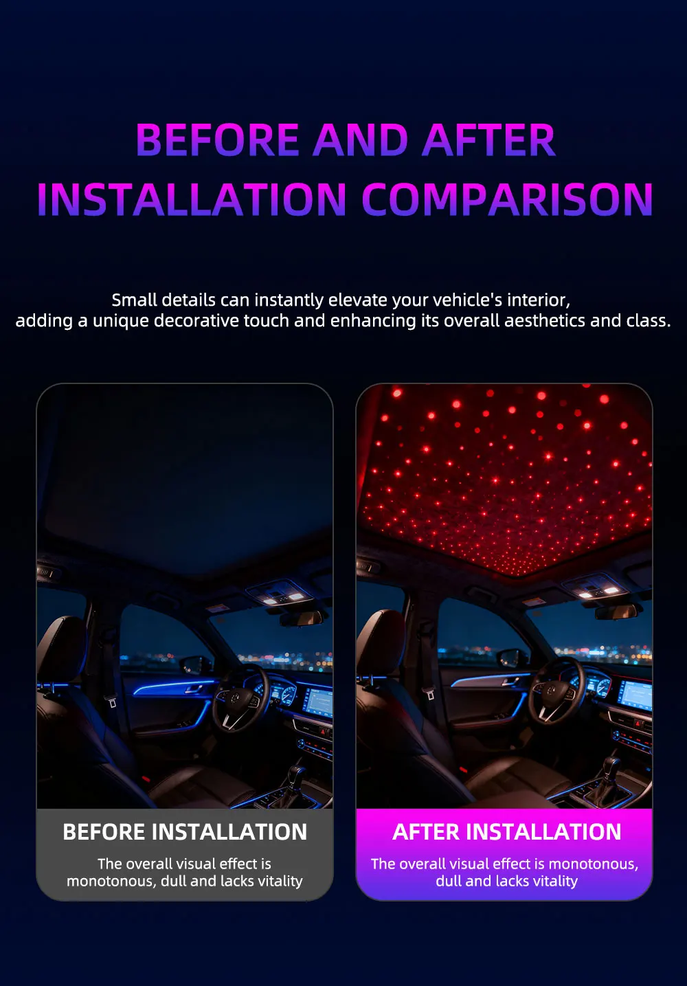 Transform your car into a magical night sky! We bring the wonder of a starry ceiling to your ride, creating an enchanting atmosphere.
